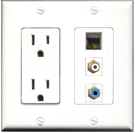 RiteAV - 15 Amp Power Outlet 1 Port RCA White 1 Port RCA Blue 1 Port Shielded Cat6 Ethernet Ethernet Decorative Wall Plate