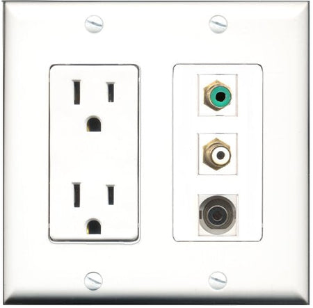 RiteAV - 15 Amp Power Outlet 1 Port RCA White 1 Port RCA Green 1 Port 3.5mm Decorative Wall Plate