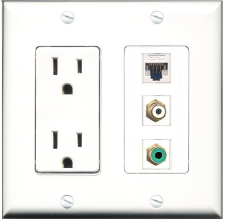 RiteAV - 15 Amp Power Outlet 1 Port RCA White 1 Port RCA Green 1 Port Cat5e Ethernet White Decorative Wall Plate