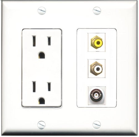 RiteAV - 15 Amp Power Outlet 1 Port RCA White 1 Port RCA Yellow 1 Port BNC Decorative Wall Plate