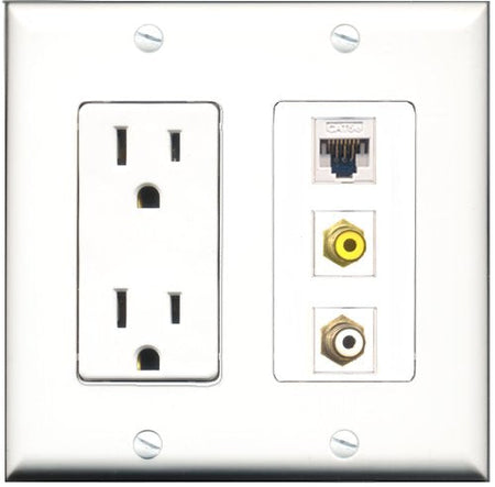 RiteAV - 15 Amp Power Outlet 1 Port RCA White 1 Port RCA Yellow 1 Port Cat5e Ethernet White Decorative Wall Plate