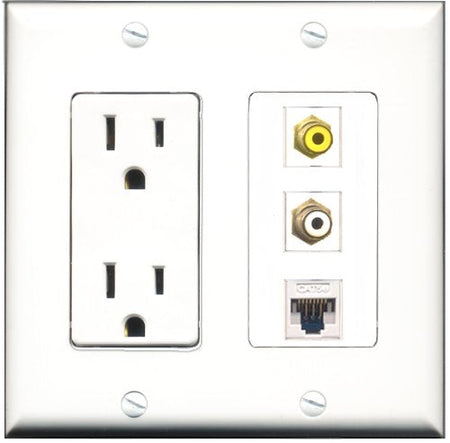RiteAV - 15 Amp Power Outlet 1 Port RCA White 1 Port RCA Yellow 1 Port Cat5e Ethernet White Decorative Wall Plate