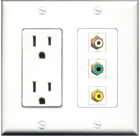 RiteAV - 15 Amp Power Outlet 1 Port RCA White 1 Port RCA Yellow 1 Port RCA Green Decorative Wall Plate