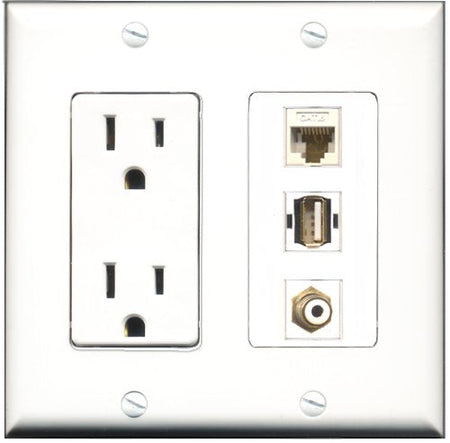 RiteAV - 15 Amp Power Outlet 1 Port RCA White 1 Port RCA Yellow 1 Port USB A-A Decorative Wall Plate