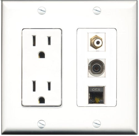 Please note: It is required to install this item in a divided outlet box. Recommended compatible outlet boxes Carlon BH234R (Old work). This is a 2 Piece Decorative Wall Plate (plate and plate cover). Tooless connection, Just plug one cable into the front and one into the back. Outlet needs to be hard wired as a regular outlet. High quality, screws included. Fits standard outlet boxes, decora(tive) plates and mounting brackets. Female on both sides of the plate jacks for easy plugin. 4 inch distance between screws. This is not a GFCI outlet and is not to be installed near or behind a kitchen sink, bathtub, bathroom or within 12-15 feet of any source of water. Must be installed into a new or existing plastic or metal outlet electrical box for safety. Do not install this with a drywall only mounting bracket.