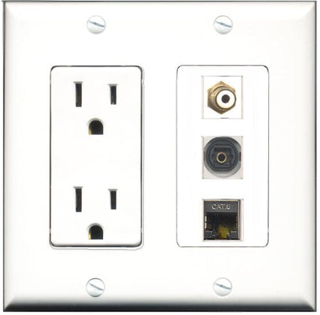 RiteAV - 15 Amp Power Outlet 1 Port RCA White 1 Port Shielded Cat6 Ethernet Ethernet 1 Port Toslink Decorative Wall Plate