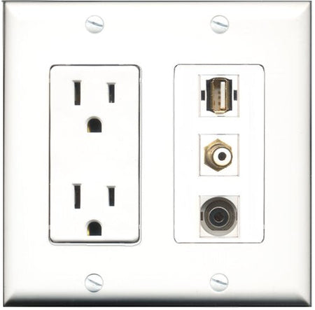 RiteAV - 15 Amp Power Outlet 1 Port RCA White 1 Port USB A-A 1 Port 3.5mm Decorative Wall Plate