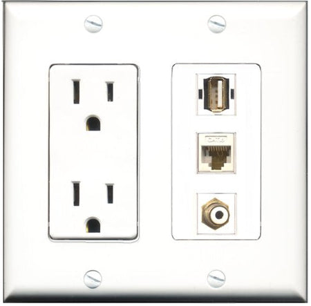 RiteAV - 15 Amp Power Outlet 1 Port RCA White 1 Port USB A-A 1 Port Cat6 Ethernet Ethernet White Decorative Wall Plate
