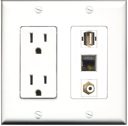 RiteAV - 15 Amp Power Outlet 1 Port RCA White 1 Port USB A-A 1 Port Shielded Cat6 Ethernet Ethernet Decorative Wall Plate