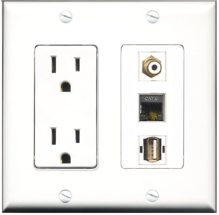 RiteAV - 15 Amp Power Outlet 1 Port RCA White 1 Port USB A-A 1 Port Shielded Cat6 Ethernet Ethernet Decorative Wall Plate