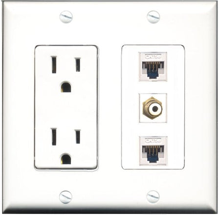 RiteAV - 15 Amp Power Outlet 1 Port RCA White 2 Port Cat5e Ethernet White Decorative Wall Plate