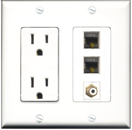 Please note: It is required to install this item in a divided outlet box. Recommended compatible outlet boxes Carlon BH234R (Old work). This is a 2 Piece Decorative Wall Plate (plate and plate cover). Tooless connection, Just plug one cable into the front and one into the back. Outlet needs to be hard wired as a regular outlet. High quality, screws included. Fits standard outlet boxes, decora(tive) plates and mounting brackets. Female on both sides of the plate jacks for easy plugin. 4 inch distance between screws. This is not a GFCI outlet and is not to be installed near or behind a kitchen sink, bathtub, bathroom or within 12-15 feet of any source of water. Must be installed into a new or existing plastic or metal outlet electrical box for safety. Do not install this with a drywall only mounting bracket.