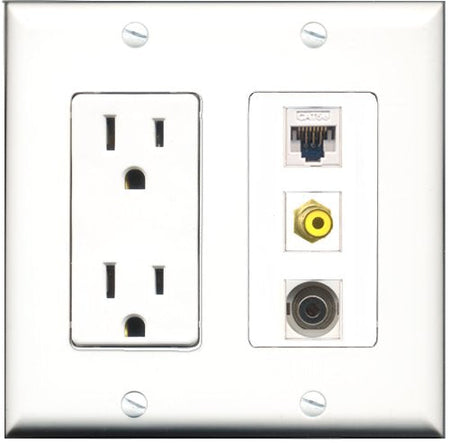 RiteAV - 15 Amp Power Outlet 1 Port RCA Yellow 1 Port 3.5mm 1 Port Cat5e Ethernet White Decorative Wall Plate