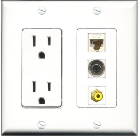 RiteAV - 15 Amp Power Outlet 1 Port RCA Yellow 1 Port 3.5mm 1 Port Cat6 Ethernet Ethernet White Decorative Wall Plate