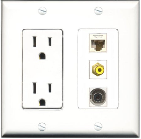 RiteAV - 15 Amp Power Outlet 1 Port RCA Yellow 1 Port 3.5mm 1 Port Cat6 Ethernet Ethernet White Decorative Wall Plate