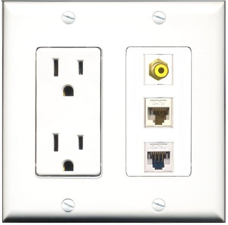 RiteAV - 15 Amp Power Outlet 1 Port RCA Yellow 1 Port Cat5e Ethernet White 1 Port Cat6 Ethernet Ethernet White Decorative Wall Plate