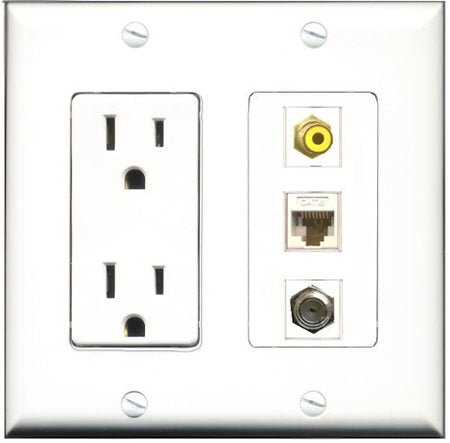 RiteAV - 15 Amp Power Outlet 1 Port RCA Yellow 1 Port Coax 1 Port Cat6 Ethernet Ethernet White Decorative Wall Plate