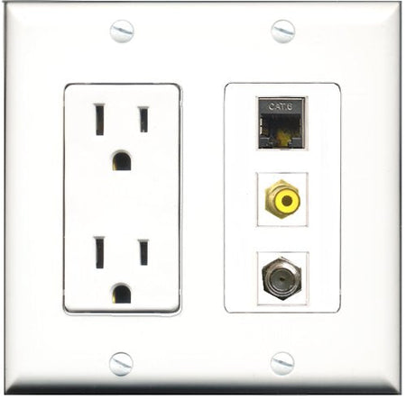 RiteAV - 15 Amp Power Outlet 1 Port RCA Yellow 1 Port Coax 1 Port Shielded Cat6 Ethernet Ethernet Decorative Wall Plate