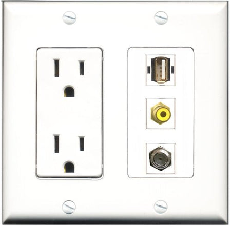 RiteAV - 15 Amp Power Outlet 1 Port RCA Yellow 1 Port Coax 1 Port USB A-A Decorative Wall Plate