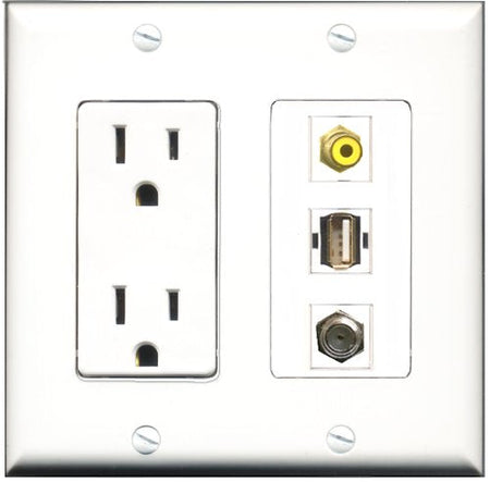 RiteAV - 15 Amp Power Outlet 1 Port RCA Yellow 1 Port Coax 1 Port USB A-A Decorative Wall Plate