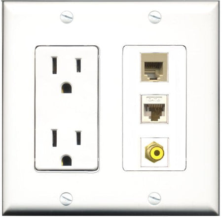 RiteAV - 15 Amp Power Outlet 1 Port RCA Yellow 1 Port Phone Beige 1 Port Cat6 Ethernet Ethernet White Decorative Wall Plate