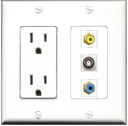 RiteAV - 15 Amp Power Outlet 1 Port RCA Yellow 1 Port RCA Blue 1 Port BNC Decorative Wall Plate