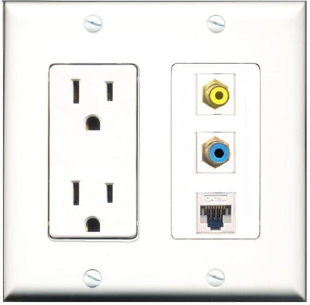 RiteAV - 15 Amp Power Outlet 1 Port RCA Yellow 1 Port RCA Blue 1 Port Cat5e Ethernet White Decorative Wall Plate