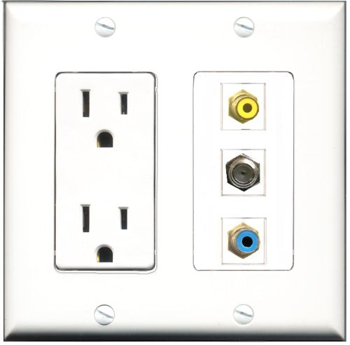 RiteAV - 15 Amp Power Outlet 1 Port RCA Yellow 1 Port RCA Blue 1 Port Coax Decorative Wall Plate