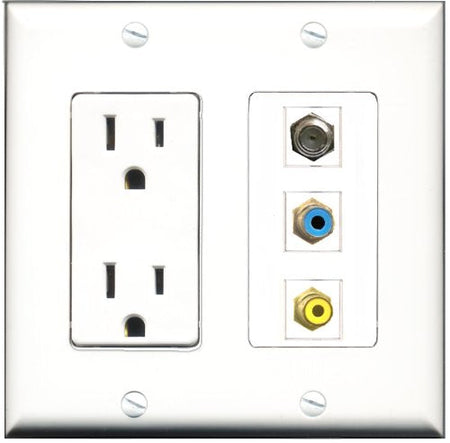 RiteAV - 15 Amp Power Outlet 1 Port RCA Yellow 1 Port RCA Blue 1 Port Coax Decorative Wall Plate