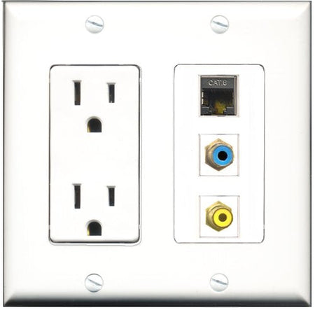 RiteAV - 15 Amp Power Outlet 1 Port RCA Yellow 1 Port RCA Blue 1 Port Shielded Cat6 Ethernet Ethernet Decorative Wall Plate