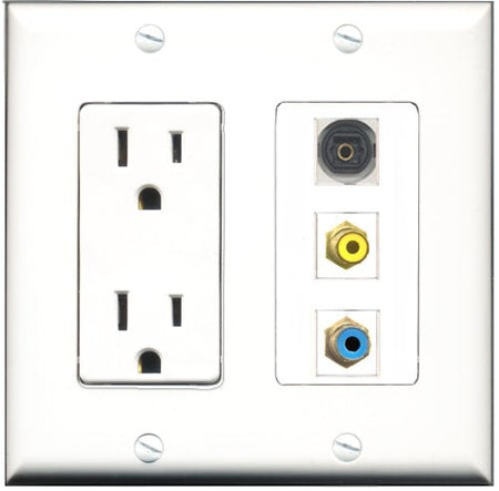 RiteAV - 15 Amp Power Outlet 1 Port RCA Yellow 1 Port RCA Blue 1 Port Toslink Decorative Wall Plate