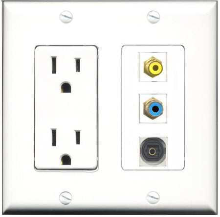 RiteAV - 15 Amp Power Outlet 1 Port RCA Yellow 1 Port RCA Blue 1 Port Toslink Decorative Wall Plate