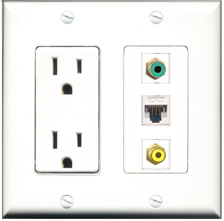 RiteAV - 15 Amp Power Outlet 1 Port RCA Yellow 1 Port RCA Green 1 Port Cat5e Ethernet White Decorative Wall Plate