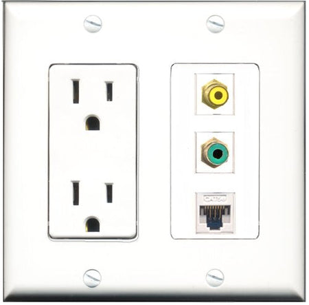 RiteAV - 15 Amp Power Outlet 1 Port RCA Yellow 1 Port RCA Green 1 Port Cat5e Ethernet White Decorative Wall Plate