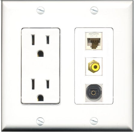 RiteAV - 15 Amp Power Outlet 1 Port RCA Yellow 1 Port Toslink 1 Port Cat6 Ethernet Ethernet White Decorative Wall Plate