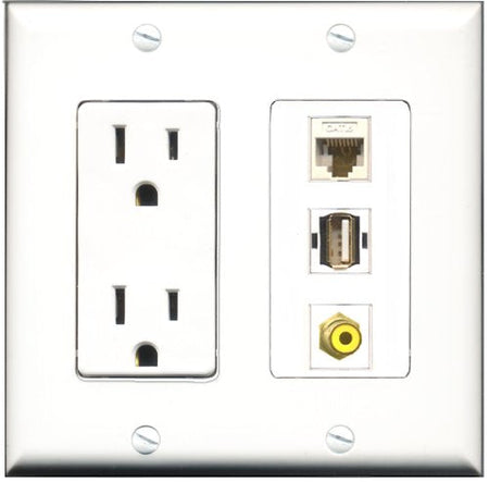 RiteAV - 15 Amp Power Outlet 1 Port RCA Yellow 1 Port USB A-A 1 Port Cat6 Ethernet Ethernet White Decorative Wall Plate