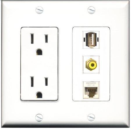 RiteAV - 15 Amp Power Outlet 1 Port RCA Yellow 1 Port USB A-A 1 Port Cat6 Ethernet Ethernet White Decorative Wall Plate
