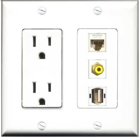 RiteAV - 15 Amp Power Outlet 1 Port RCA Yellow 1 Port USB A-A 1 Port Cat6 Ethernet Ethernet White Decorative Wall Plate