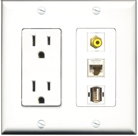 RiteAV - 15 Amp Power Outlet 1 Port RCA Yellow 1 Port USB A-A 1 Port Cat6 Ethernet Ethernet White Decorative Wall Plate