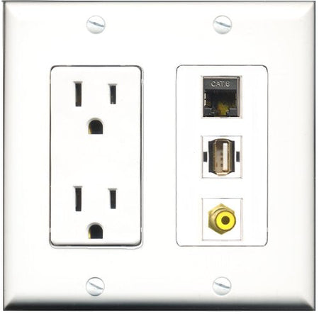 RiteAV - 15 Amp Power Outlet 1 Port RCA Yellow 1 Port USB A-A 1 Port Shielded Cat6 Ethernet Ethernet Decorative Wall Plate