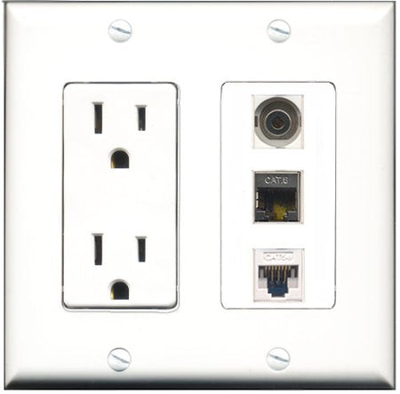 RiteAV - 15 Amp Power Outlet 1 Port Shielded Cat6 Ethernet Ethernet 1 Port 3.5mm 1 Port Cat5e Ethernet White Decorative Wall Plate