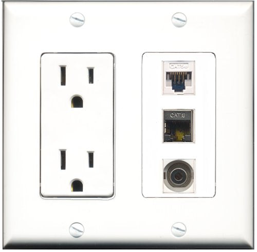 RiteAV - 15 Amp Power Outlet 1 Port Shielded Cat6 Ethernet Ethernet 1 Port 3.5mm 1 Port Cat5e Ethernet White Decorative Wall Plate