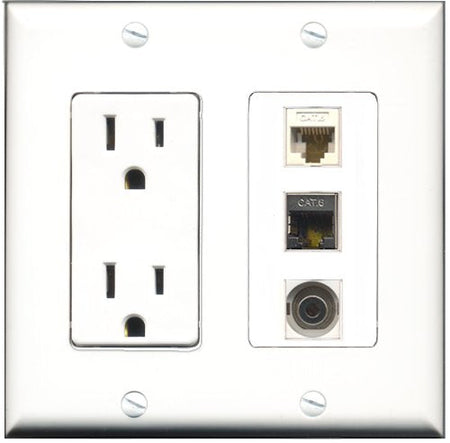 RiteAV - 15 Amp Power Outlet 1 Port Shielded Cat6 Ethernet Ethernet 1 Port 3.5mm 1 Port Cat6 Ethernet Ethernet White Decorative Wall Plate