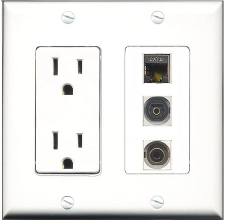 RiteAV - 15 Amp Power Outlet 1 Port Shielded Cat6 Ethernet Ethernet 1 Port Toslink 1 Port 3.5mm Decorative Wall Plate