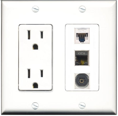 RiteAV - 15 Amp Power Outlet 1 Port Shielded Cat6 Ethernet Ethernet 1 Port Toslink 1 Port Cat5e Ethernet White Decorative Wall Plate