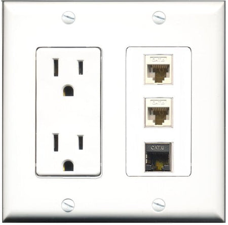 RiteAV - 15 Amp Power Outlet 1 Port Shielded Cat6 Ethernet Ethernet 2 Port Cat6 Ethernet Ethernet White Decorative Wall Plate