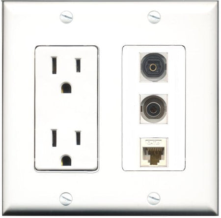 RiteAV - 15 Amp Power Outlet 1 Port Toslink 1 Port 3.5mm 1 Port Cat6 Ethernet Ethernet White Decorative Wall Plate