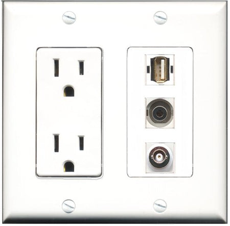 RiteAV - 15 Amp Power Outlet 1 Port USB A-A 1 Port 3.5mm 1 Port BNC Decorative Wall Plate