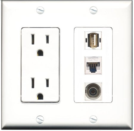 RiteAV - 15 Amp Power Outlet 1 Port USB A-A 1 Port 3.5mm 1 Port Cat5e Ethernet White Decorative Wall Plate