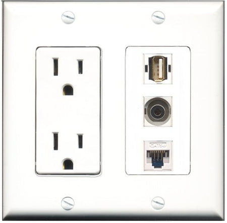 RiteAV - 15 Amp Power Outlet 1 Port USB A-A 1 Port 3.5mm 1 Port Cat5e Ethernet White Decorative Wall Plate